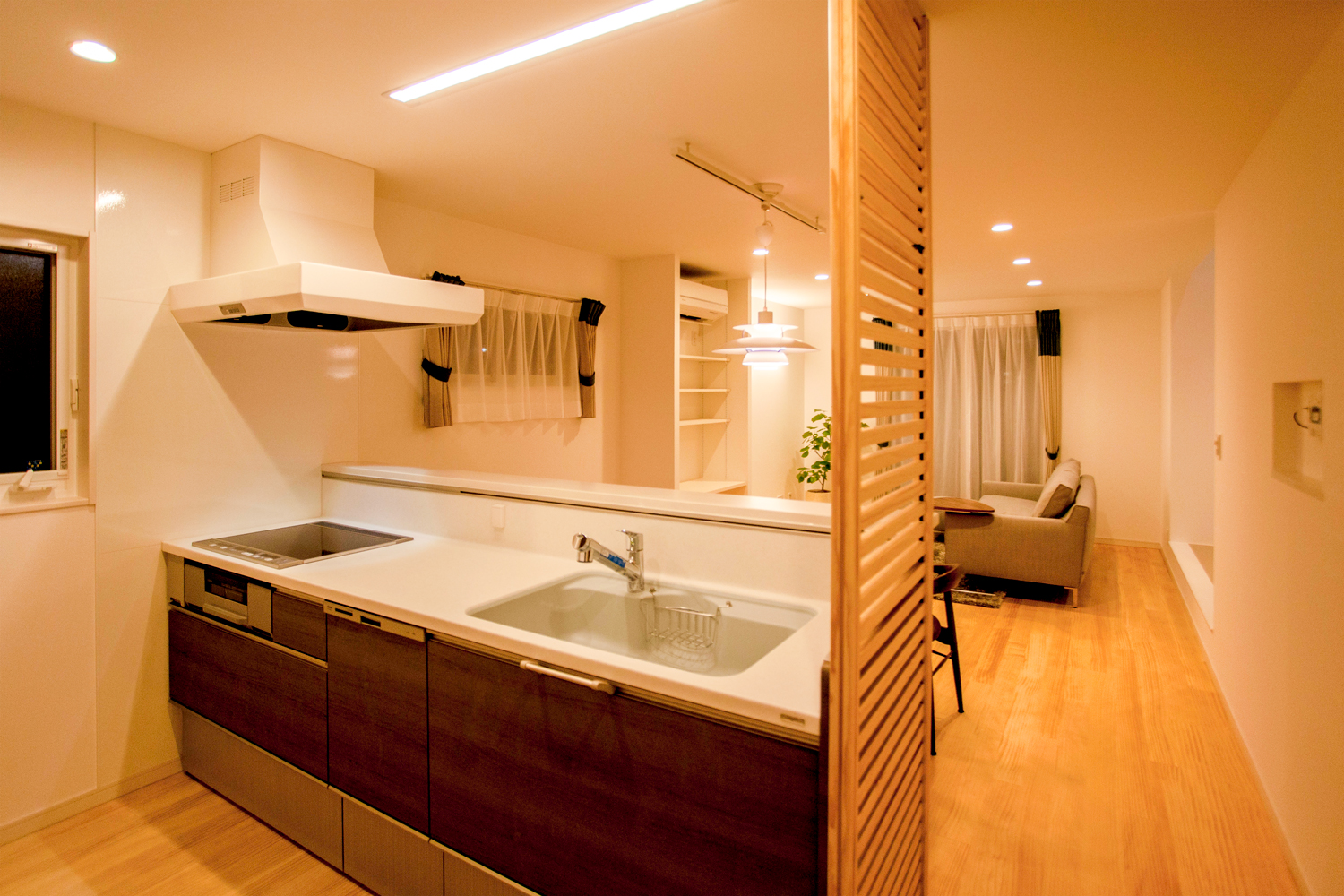 キッチン横のパーテーションは来客時の目隠しに。パントリーにもロールスクリーンを設置し、すっきり見せられるキッチンです。