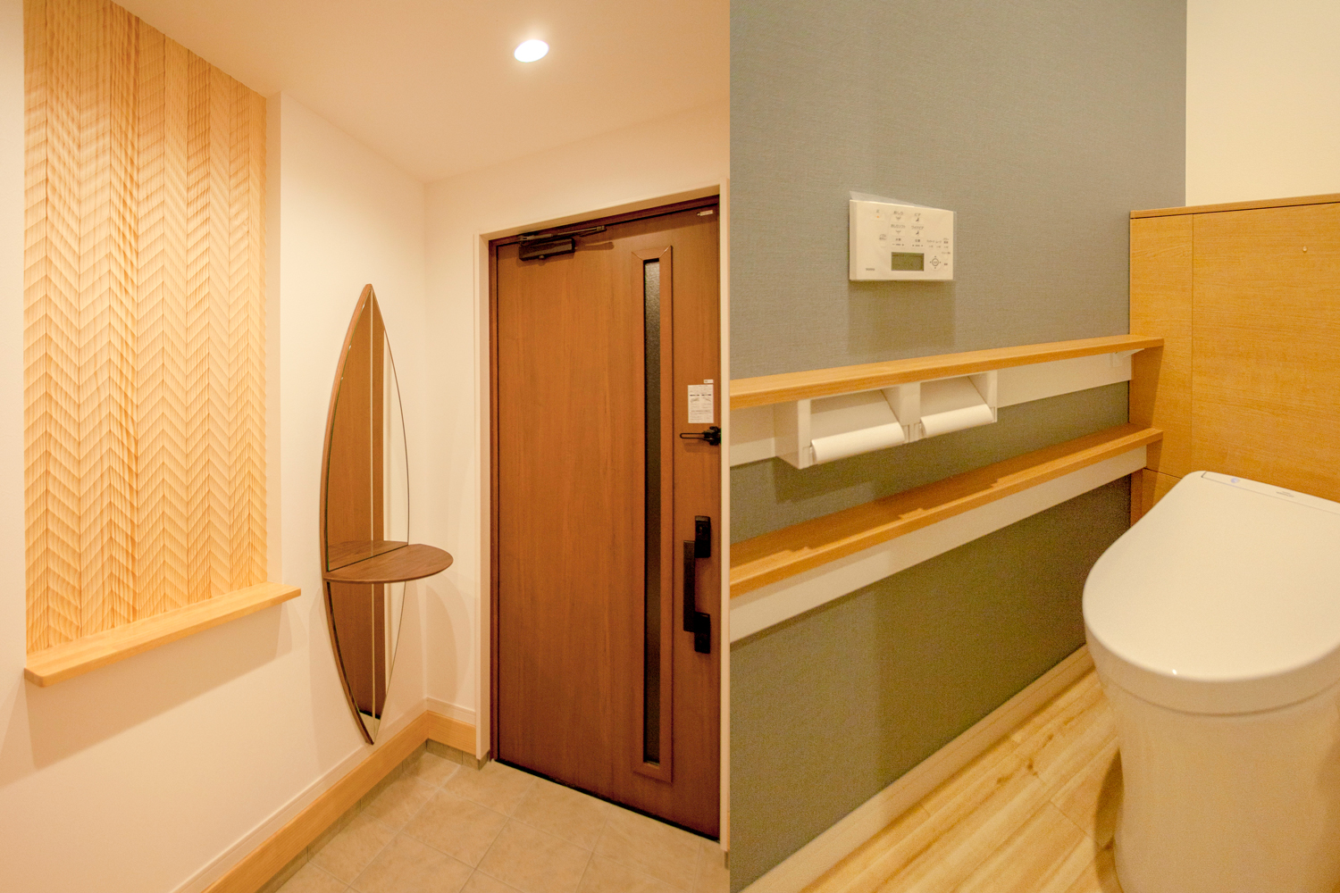 左:玄関にはサーフボード型のミラー。無垢材を使用したニッチとの相性も抜群。