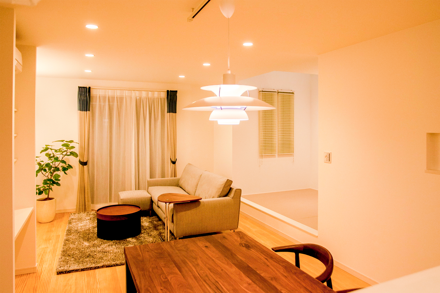 キッチンから見渡せるリビングダイニング。3帖の和室は床上げしてあり、リビングソファと目線の高さを合わせてあります。また、和室は吹き抜けになっていて、南からの光が入り、2階のフリースペースからも覗けます。