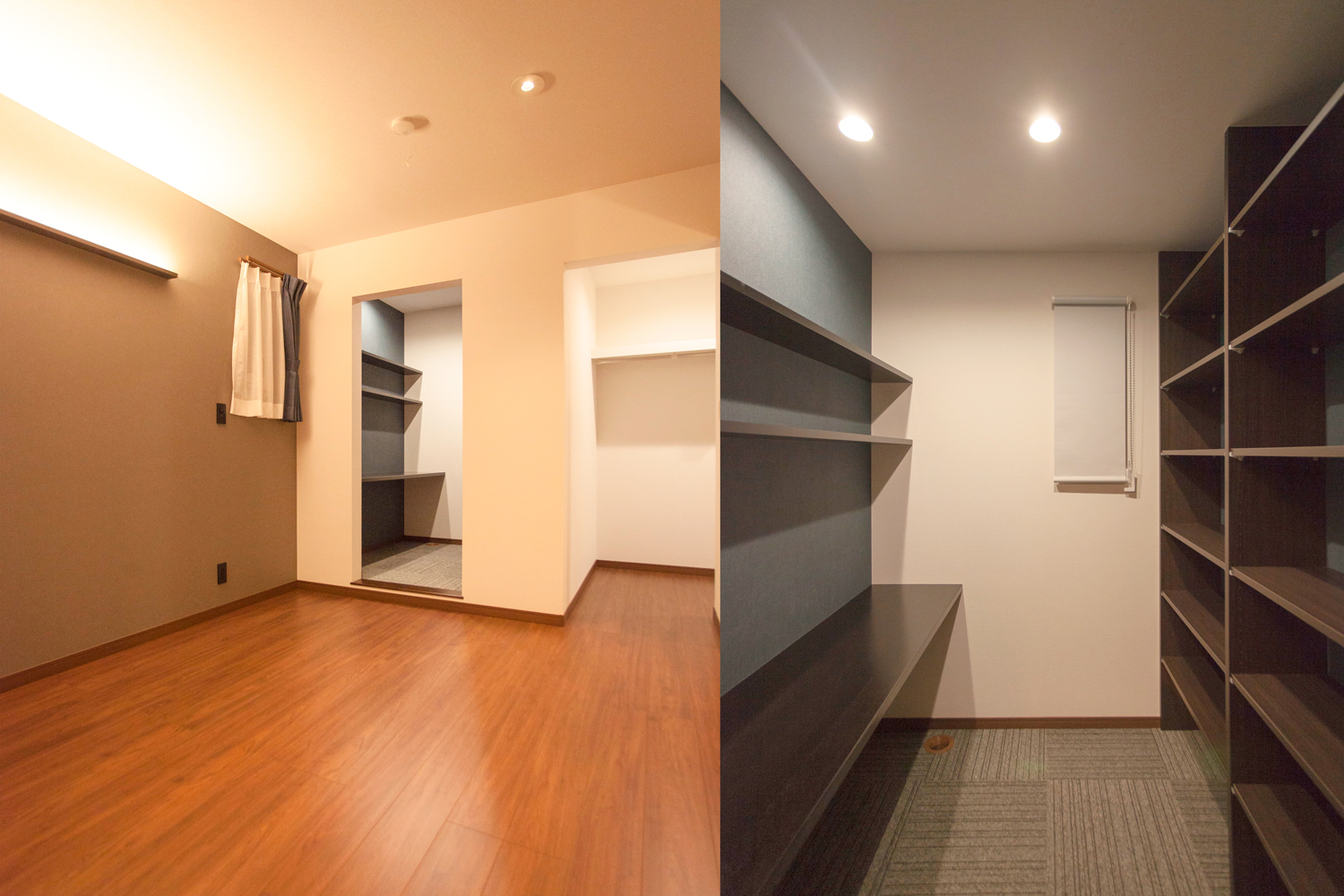 間接照明が暖かい雰囲気を作る主寝室。隣にウォークインクローゼットと書斎を配置。