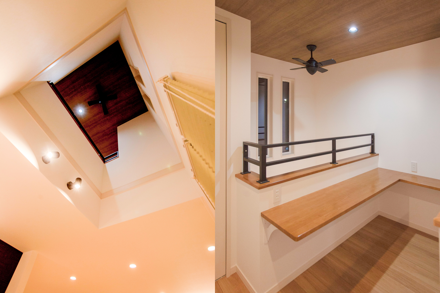 和室の吹き抜けに続くのは2階のフリースペース。1階の生活音も感じながら読書や勉強など、使い方は自由。