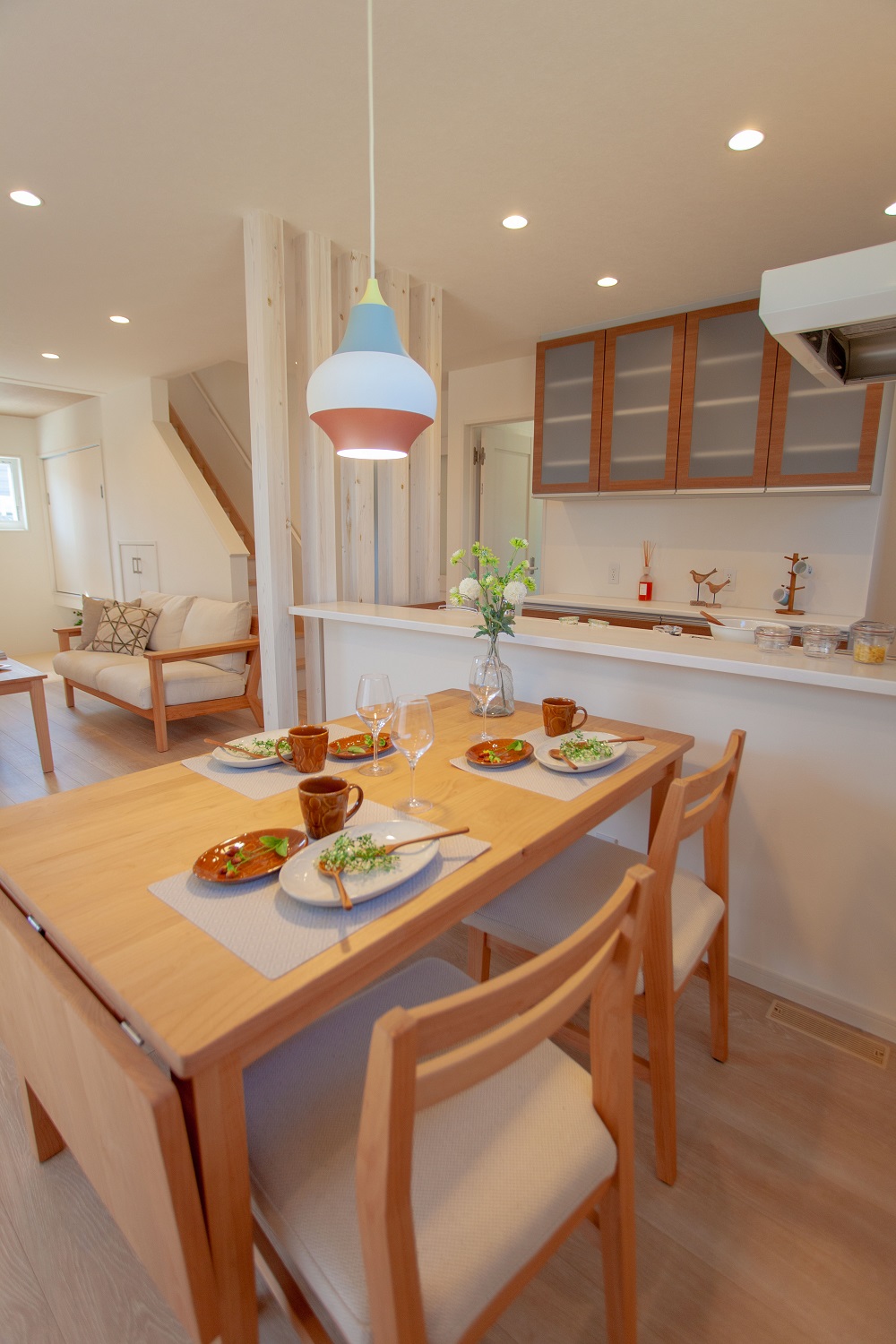 またキッチンカウンターの横には列柱を設置し、さりげなく空間を分ける工夫も。