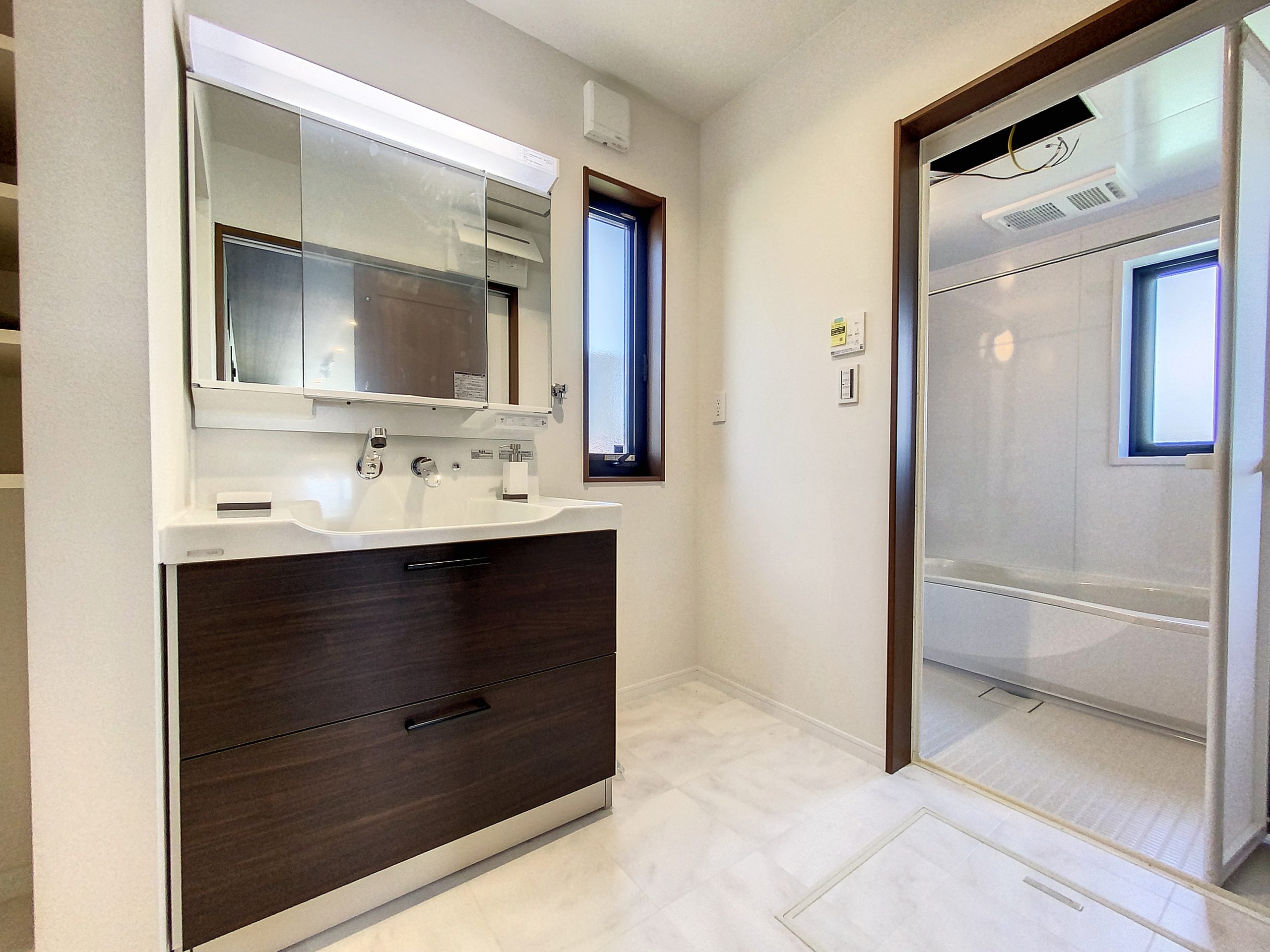 三面鏡のある大きな洗面台を設置。