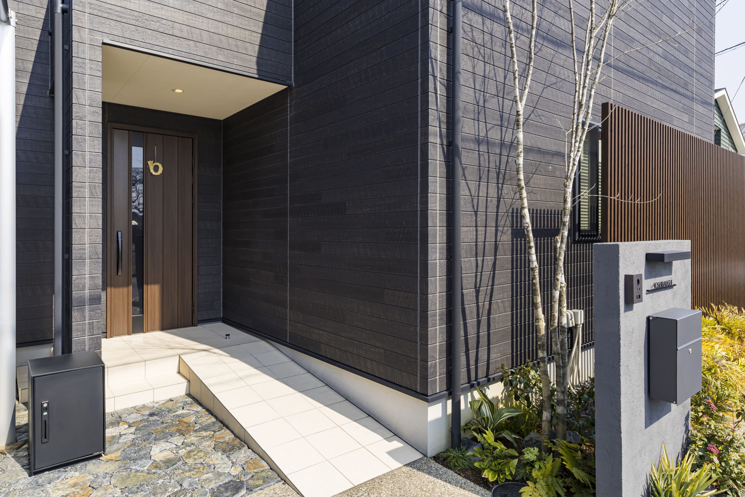 外部からの視線を適度に遮りつつ、植栽と調和することで、自然と共に暮らす穏やかな日々を演出します。 -