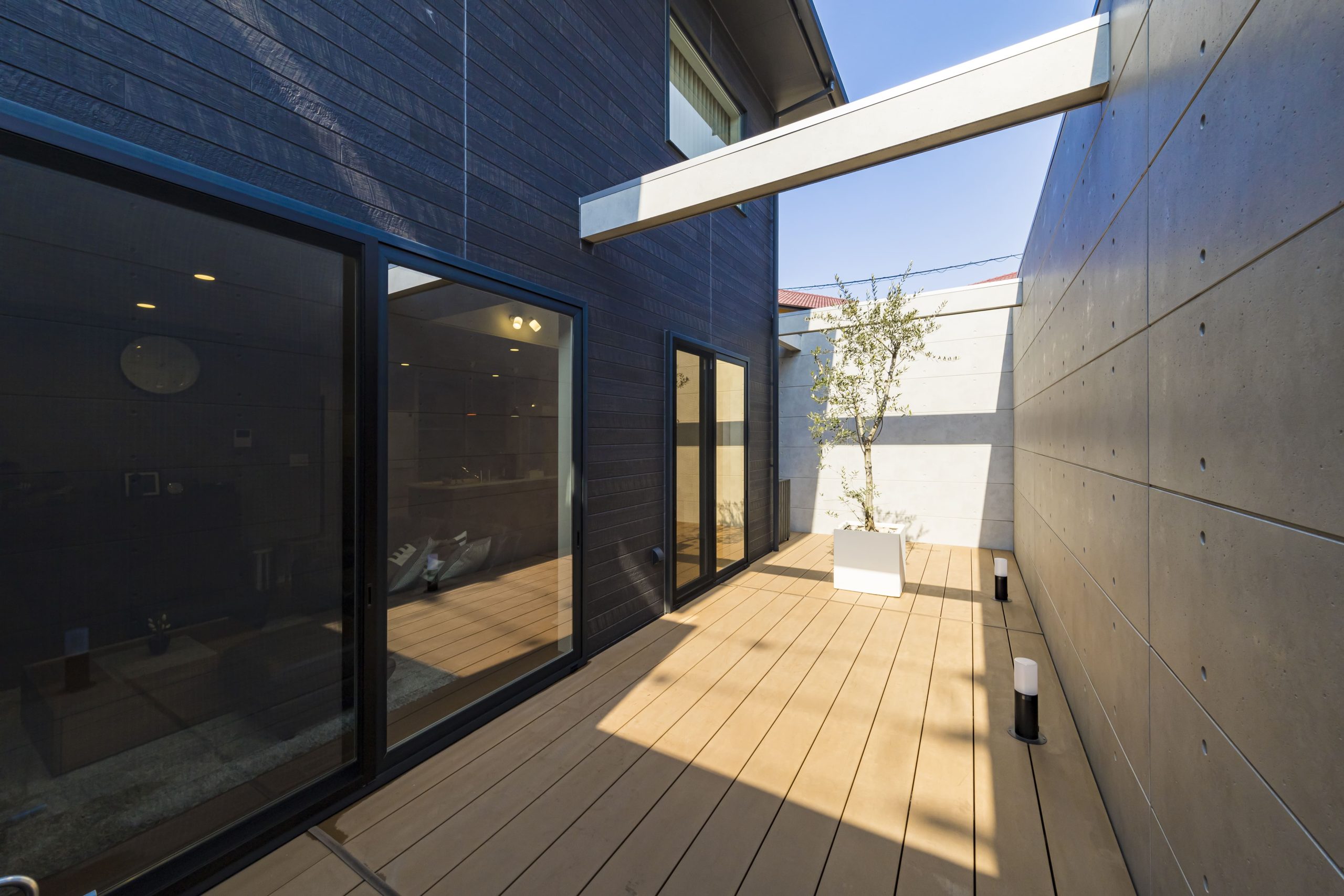 高い壁が周囲の視線を遮りながらも、空へと開く構成が、屋外にいながら包まれるような安心感をもたらします。 -