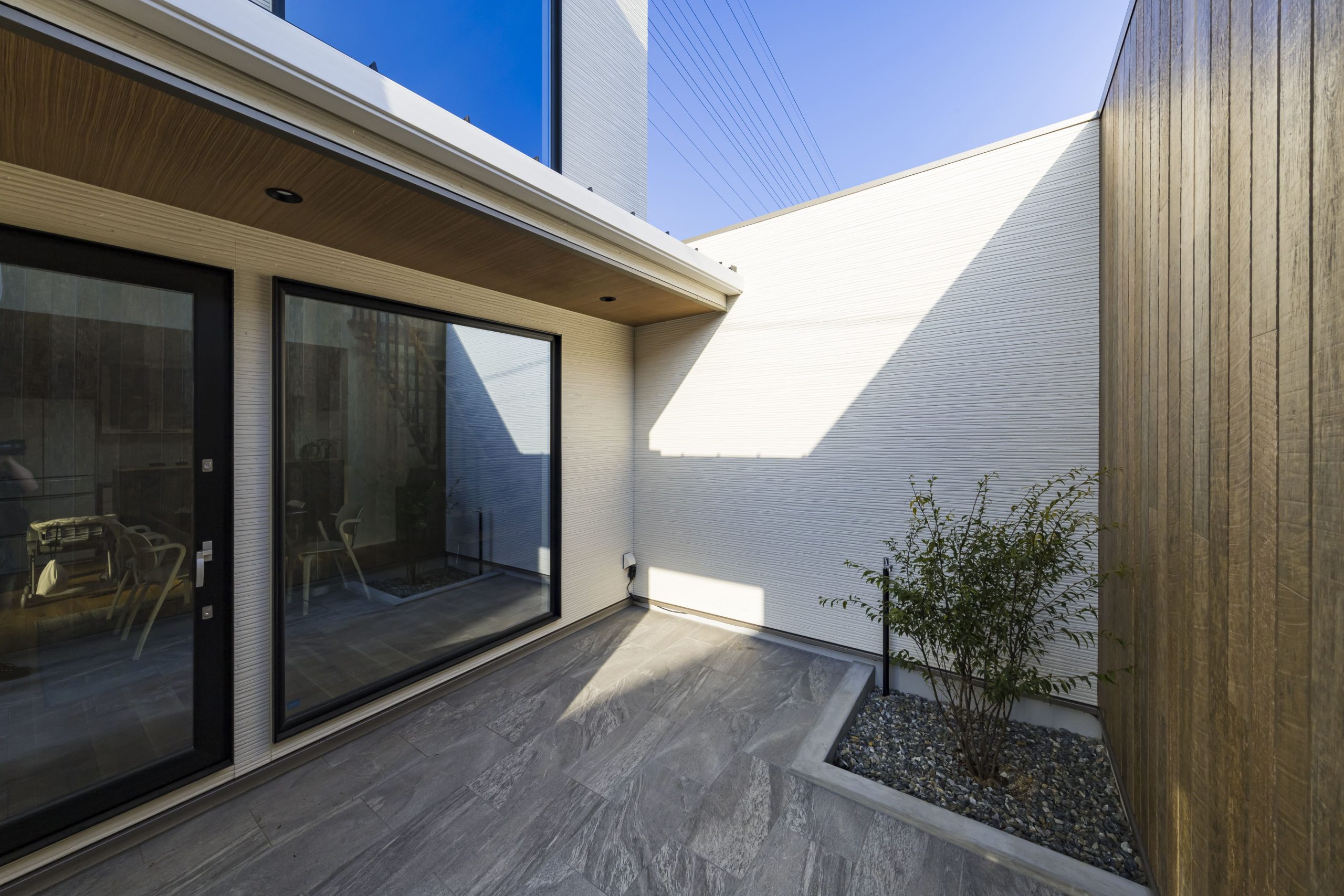 室内とゆるやかにつながる中庭は、光と風を取り込みながらも外部の視線を遮る安心設計。