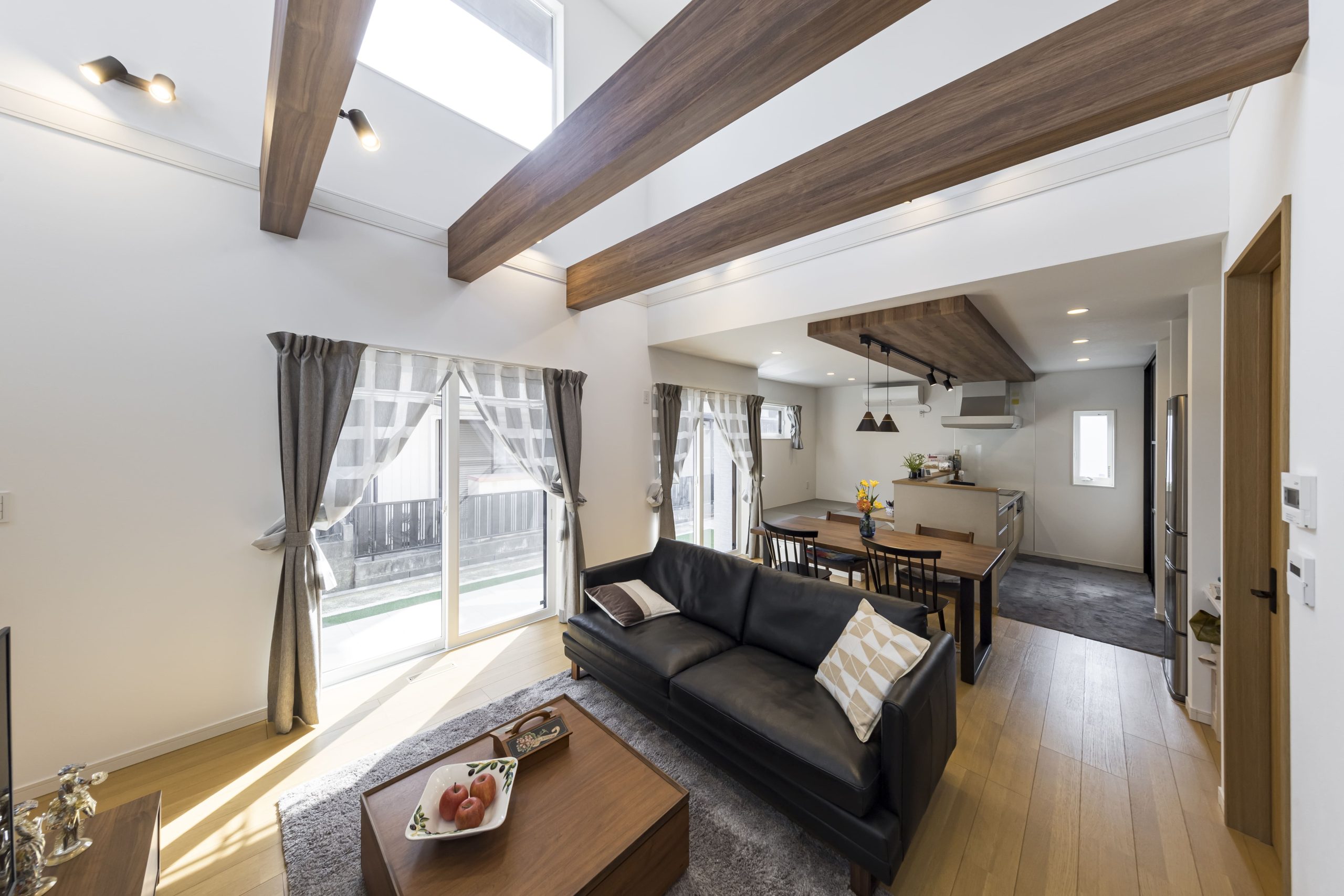 自然光がたっぷり差し込む吹き抜け空間に、大胆に架けられた木目の梁が美しいアクセントを添えています。天井が高く、開放感抜群のリビングは、家族の団らんの場にぴったり。ダイニングとキッチンも一直線に配置されており、視線が抜けて空間がより広く感じられる設計です。