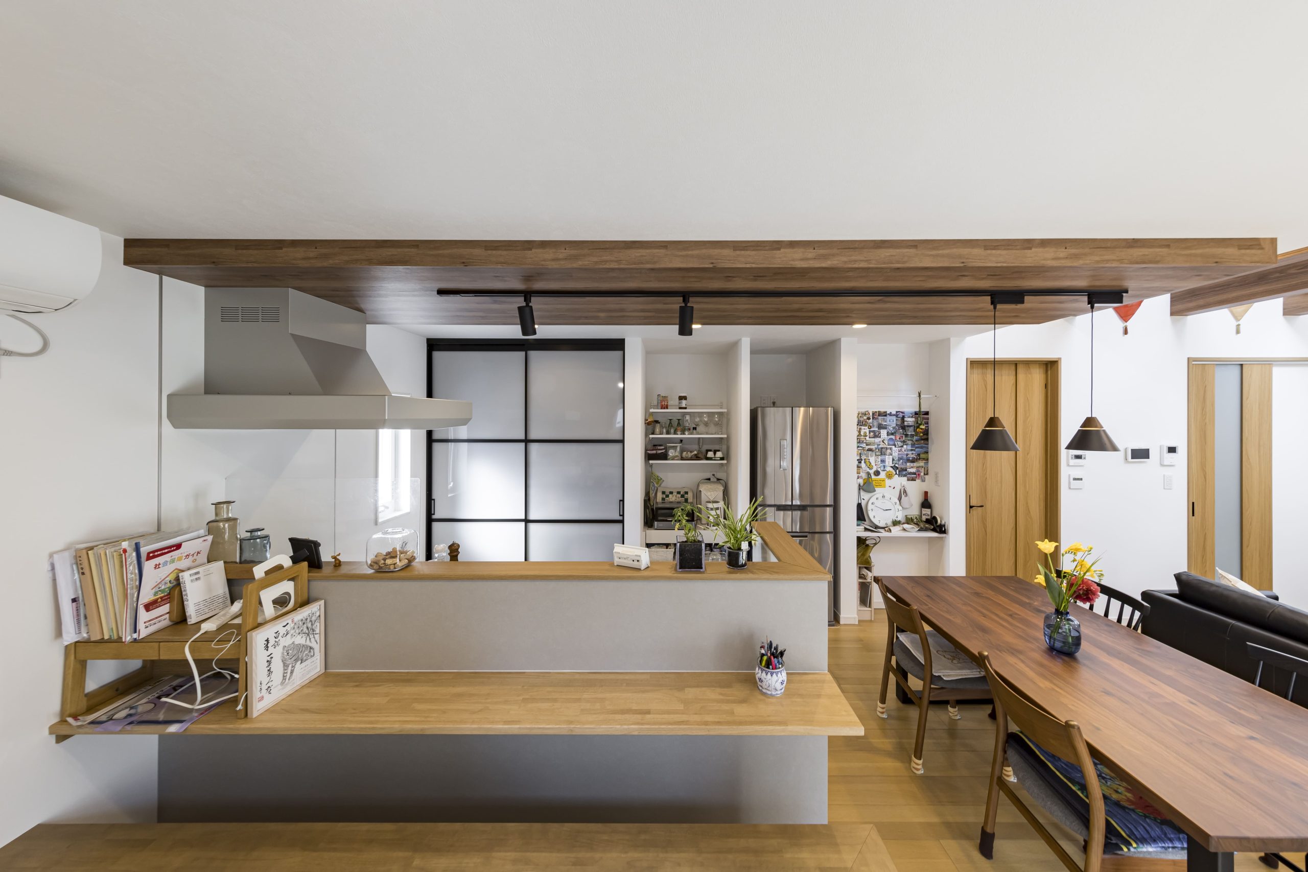 家事の合間に子どもと過ごしたり、ちょっとした作業をしたりするのにぴったりな機能的デザイン。背面収納は、棚板やガラス扉付きキャビネットなど多彩な要素が組み合わされ、使い勝手と見た目を両立させています。 -