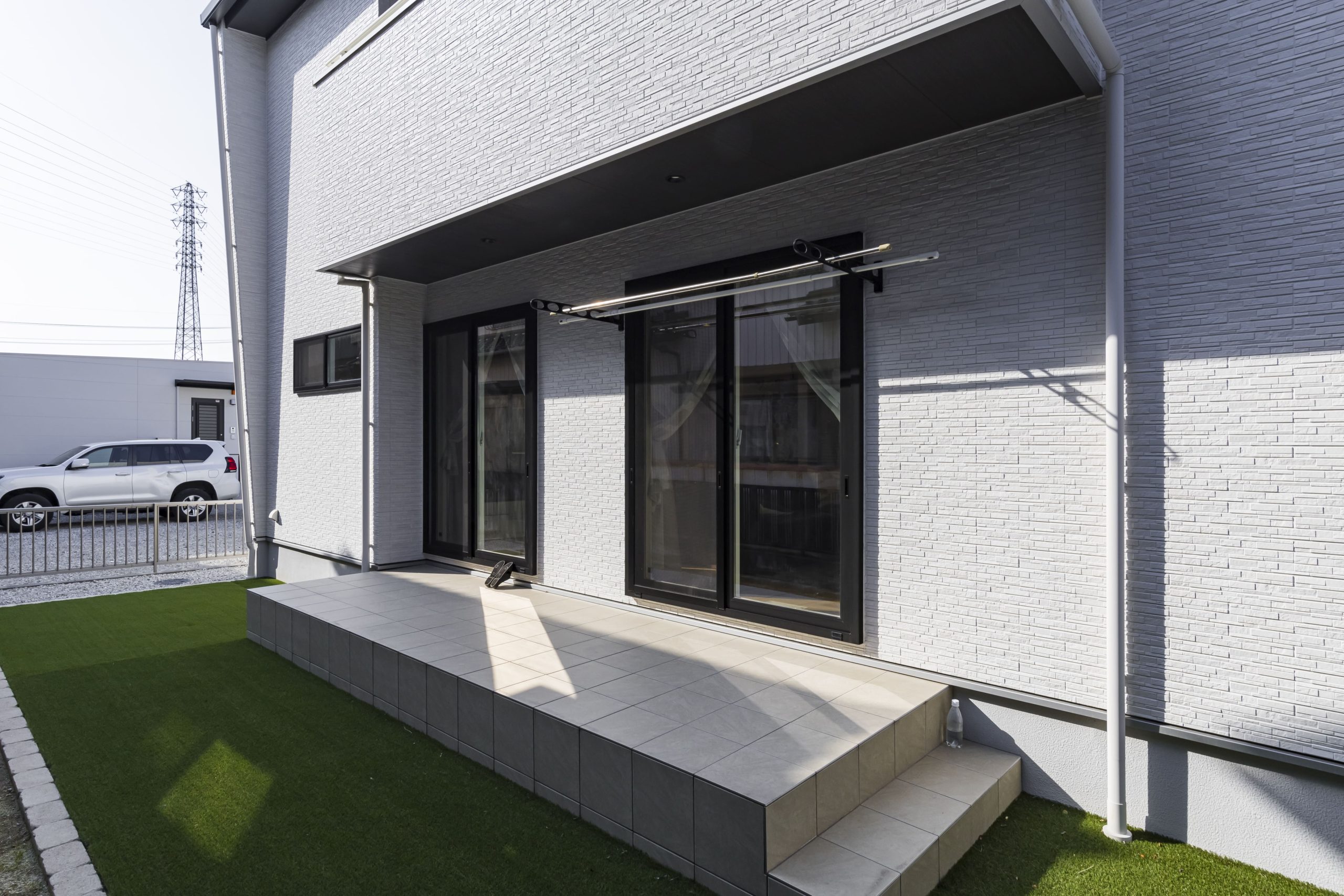 屋外とのつながりを感じる広々としたウッドデッキ。掃き出し窓から出入りしやすく、天気の良い日には家族でティータイムを楽しんだり、子どもが遊んだりできる場所として大活躍します。人工芝との相性も良く、見た目にもやさしい印象に仕上がっています。